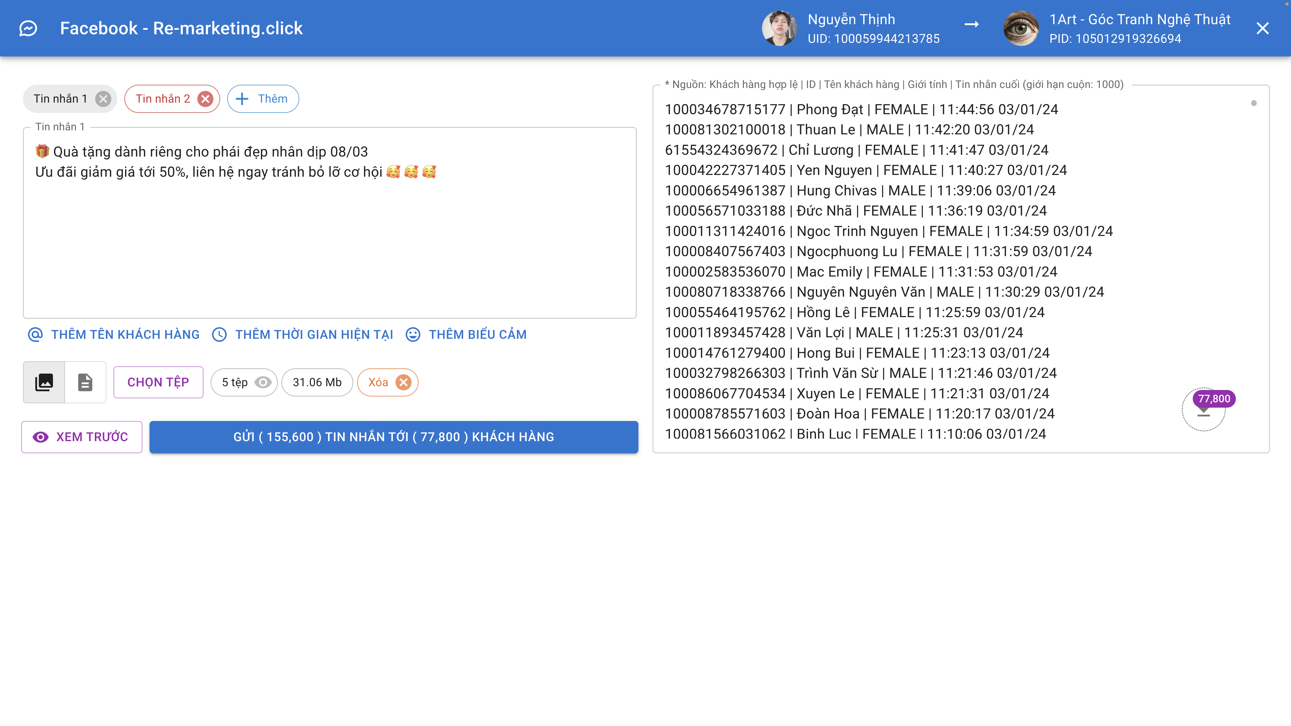 <figure><img src="https://994150511-files.gitbook.io/~/files/v0/b/gitbook-x-prod.appspot.com/o/spaces%2FB78DMjSAhD1PCW7UHayV%2Fuploads%2FWT1gmOghv2KZrkRKfOgS%2FScreenshot%202024-01-10%20at%2018.18.13.png?alt=media&#x26;token=318e58e7-a807-4726-ab71-e7178a17ddde" alt=""><figcaption><p>Chọn đối tượng khách hàng để gửi tin nhắn</p></figcaption></figure>